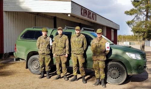 Kuvassa tehtävässä mukana olevia varusmiehiä Kiparkatissa 9.4.2020.