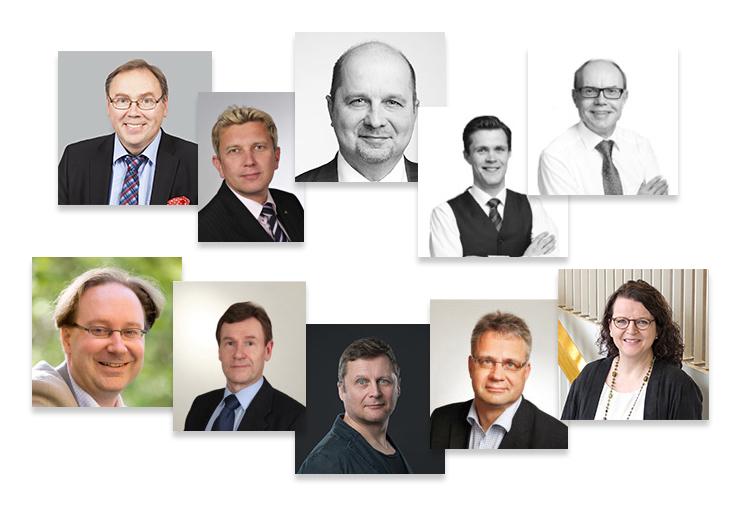 Kuvassa (vasemmalta ylhäältä) terveyttämisen asiantuntijat Urpo Pirilä ja Jukka Virta (RSM), Jukka Laakso, Touko Raitis ja Jari Malinen (Asianajotoimisto Eversheds), Antti Lehtimäki (Konsulttiyhtymä AIKA), Harri Mäkinen (Incoserv), Sam Hansen (LM Someco), Petri Merisaari (Merifam) ja Sari-Anne Poikkijoki (Åma). (Kuva: Kasvuyrittäjäpalvelu)