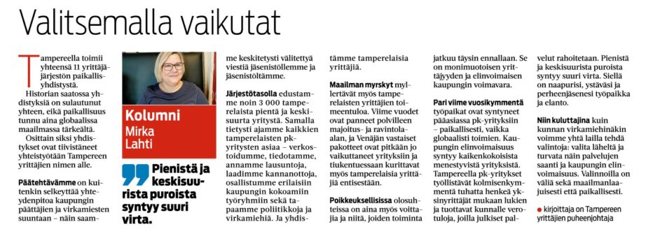 Tampereen yrittäjien puheenjohtajan kolumni Tamperelainen-lehdessä 24.3.2022 klo 12:17 Uutinen #elinkeinopolitiikka #järjestö #jäsenyys #kunta #puheenaihe Valinnoilla vaikutat Tämä teksti on konekäännetty. Puheenjohtajamme ajatuksia Tamperelaisen keskiviikon 23.3.2022 numerossa vaikuttamisesta ja kunnan elinvoimasta.Kolumnin voit lukea näköislehden sivulta 38. Jaa Kopioitu leikepöydälle