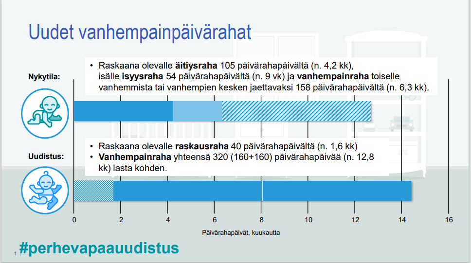Vanhempainvapaapäivien määrä kasvaa ja vapaiden käytön joustavuus lisääntyy. Vanhempainvapaauudistus pyrkii lisäämään työelämän ja vanhempien tasa-arvoa sekä huomioimaan nykyistä paremmin erilaiset perhemuodot. Uudet vanhempainvapaat koskevat pääsääntöisesti lapsia, joiden laskettu syntymäaika on 4.9.2022 tai sen jälkeen.