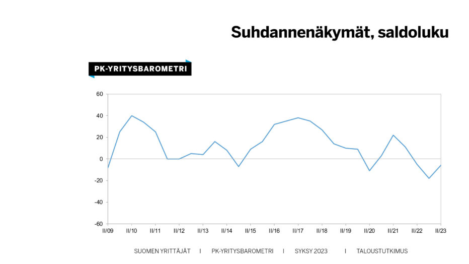Pk-yritysten odotukset tulevasta ovat parantuneet viime keväästä. Energiakriisin ja Ukrainan sodan vaikutusten tasaantuminen ovat palauttaneet odotukset lähelle vuoden takaista poikkeuksellisen negatiivisen kevään jälkeen. Odotuksista kertoo tuore Suomen Yrittäjien, Finnveran ja TEM:n teettämä pk-yritysbarometri.