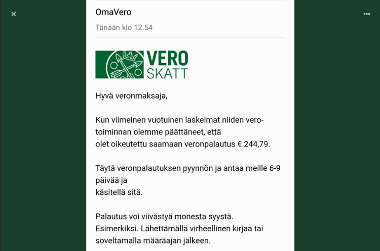 Verottajan logolla varustettu viesti on kirjoitettu todella huonolla suomen kielellä: ”Hyvä veronmaksaja, kun viimeinen vuotuinen laskelmat niiden verotoiminnan olemme päättäneet, että olet oikeutettu saamaan veronpalautus € 244,79.”