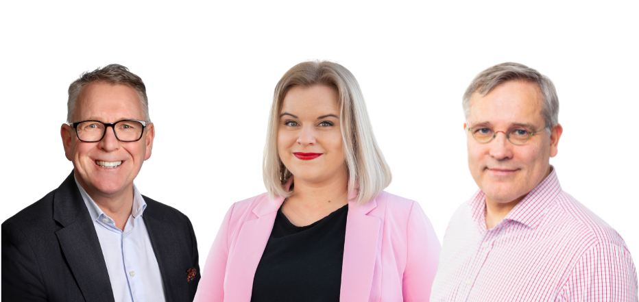 Maakuntajohtaja Jyri Arponen, vt. toimitusjohtaja Jutta Wirén ja toimitusjohtaja Mikael Pentikäinen.