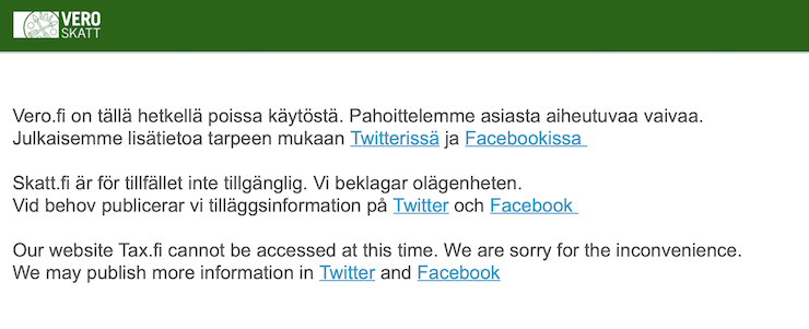 Vero.fi -verkkosivusto on ollut aamun aikana pois käytöstä.
