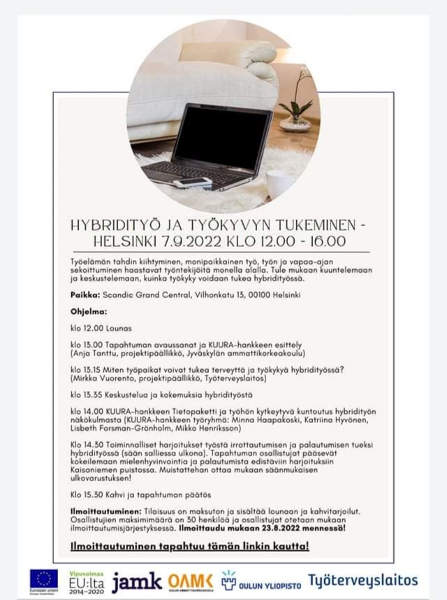 Hybridityö ja työkyvyn tukeminen -tapahtuma järjestetään Helsingissä 7.9.2022 klo 12.00 – 16.00 Scandic Grand Central Helsingin tiloissa.