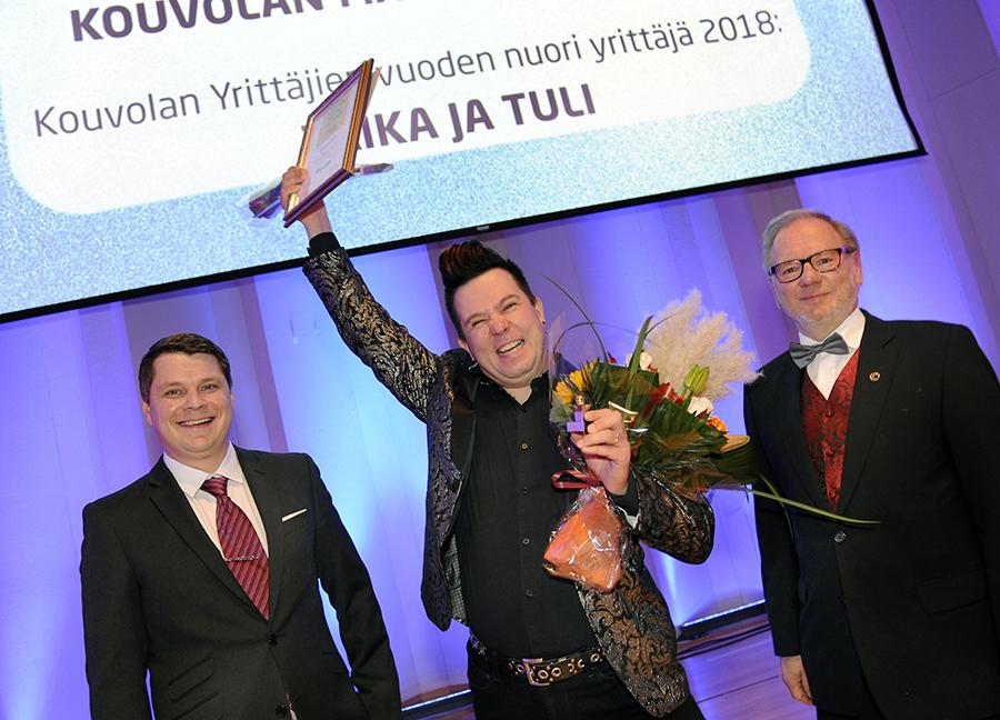 Kouvolan Yrittäjien palkitsema vuoden nuori yrittäjä Janne Mustonen näyttää esimerkkiä kuinka tuuletetaan saadessaan huomionosoitus järjestöltä.