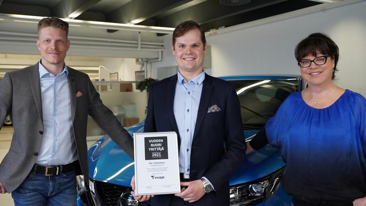 Kuopion Yrittäjät luovutti kevätkokouksen yhteydessä 29.4. vuoden 2021 Nuori Yrittäjä tunnustuksen Väänäsen auto Oy:n yrittäjä Aki Väänäselle. – Yrittäjyys jo kolmannessa polvessa on mahtava saavutus sinänsä, kovin montaa sellaista yritystä ei taida Kuopiosta löytyä. Lisäksi autokauppa toimialana on ollut viime vuosina ollut isojen myllerrysten kohteena, on varmasti vaatinut taitoa ja kykyä uusiutua merkittävien ostokäyttäytymisen muutosten myötä, listasi Kuopion Yrittäjien puheenjohtaja Sirpa Karppi palkitsemisen perusteita. Tunnustus luovutettiin yhdessä yhteistyökumppani Väreen myyntijohtaja Tommi Riikosen kanssa.