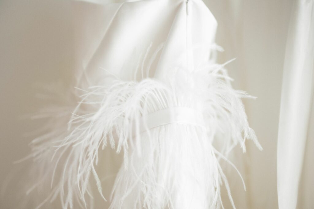 Ruuthin suunnittelema puku on valkoinen, ja asun kruunaa strutsinsulkavyö.