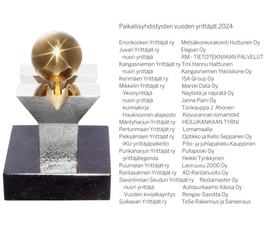 Paikallisyhdistysten vuoden yrittäjäpalkinnot 2024 on myönnetty yrittäjille ja yrityksille, jotka omalla esimerkillään ovat nostaneet yksityisen yrittäjyyden arvostusta ja näyttäneet, miten rohkeus tarttua taloudellisiin riskeihin voi johtaa paitsi menestykseen, myös koko paikkakunnan ja yhteisön hyötyyn.