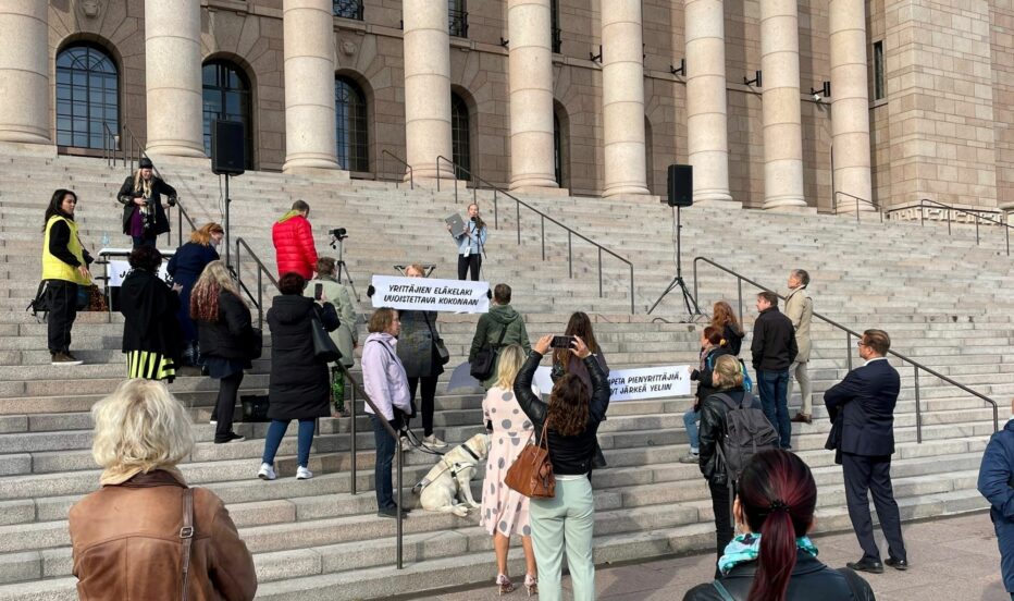 Joukko yksin- ja mikroyrittäjiä järjesti tiistaina Helsingissä mielenosoituksen yrittäjän eläkelain uudistusta vastaan. Eduskuntatalon portailla käytettiin lakimuutosta vastustavia puheenvuoroja, ja myös kansanedustajia nähtiin paikalla puhumassa.