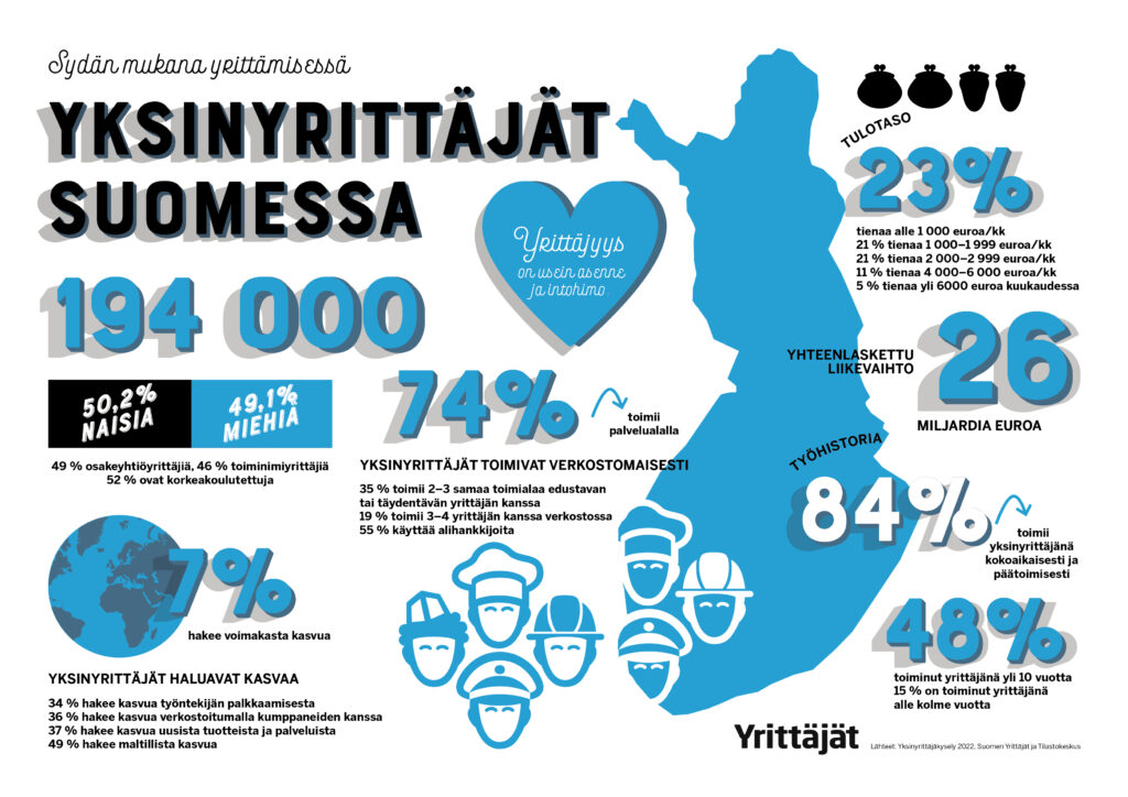 Yksinyrittäjä ei ole tilanteessaan yksin. Uudenmaan Yrittäjien alueen jäsenistä 58 prosenttia on yksinyrittäjiä. Yrittäjätapahtumiin osallistuminen on hyväksi koettu tapa laajentaa verkostoa, saada uusia tuttavuuksia ja jopa ystävyyssuhteita.