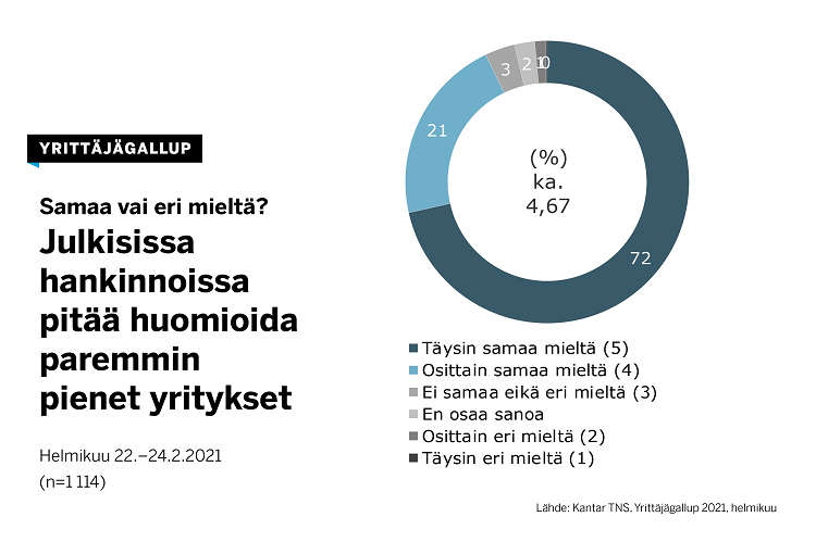 Yrittäjägallupin mukaan yrittäjistä 93 prosenttia on sitä mieltä, että julkisissa kilpailutuksissa pitää huomioida paremmin pienet yritykset. Täysin samaa mieltä asiasta oli 72 prosenttia yrittäjistä.