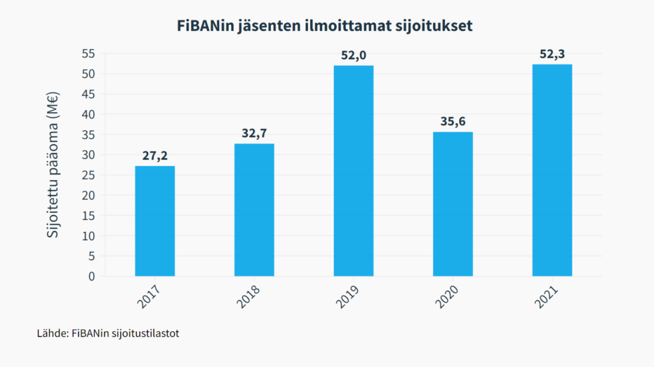 Yksityisten startup-sijoittajien aktiivisuus nousi ennätystasolle koronavuoden 2020 laskun jälkeen. Aikaisen vaiheen riskisijoittajat sijoittivat vuonna 2021 yhteensä 52,3 miljoonaa euroa arviolta 626 startupiin.