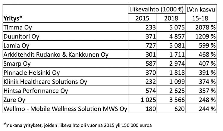 Liikevaihtoaan prosentuaalisesti 2015–2018 eniten kasvattaneet Aalto Startup Center -gasellit: