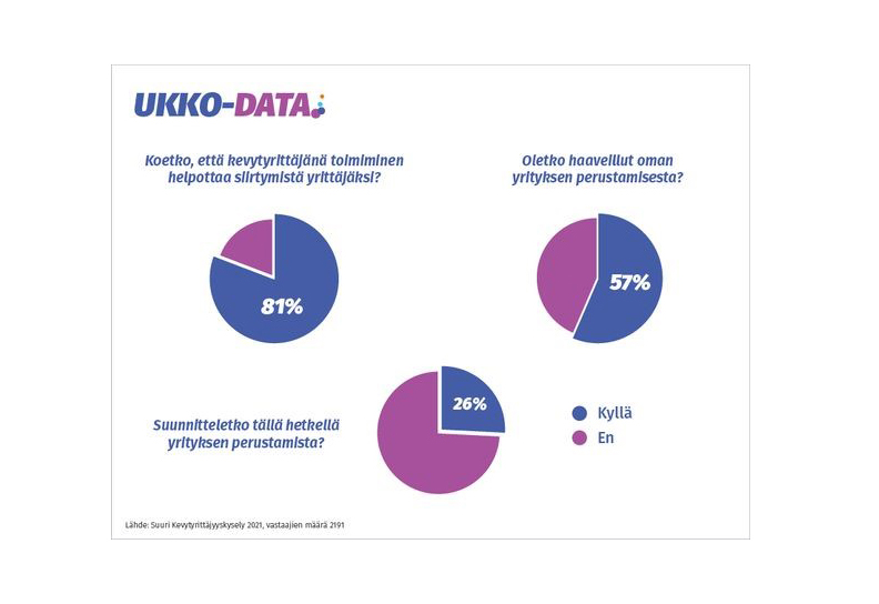 Laskutuspalvelu Ukko.fi teetti loppuvuodesta 2021 kyselyn, jossa se selvitti kevytyrittäjien motiiveja yrittäjyyteen ja esimerkiksi Y-tunnukselliseen yrittäjyyteen. Kyselyssä kartoitettiin myös ajatuksia työstä ja työn tulevaisuudesta.