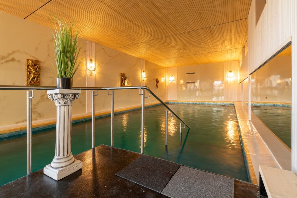 Kylpylän sisällä näkymä ei vastaa aivan sitä, mihin suomalaiset kylpyläasiakkaat ovat kenties tottuneet. Pinnat näyttävät tavallista arvokkaammilta, tiloissa on useita kattokruunuja, patsaita, pilareita ja marmorimaisia pintoja, joita on ryyditetty erilaisilla väritehosteilla ja kullan hohteella.