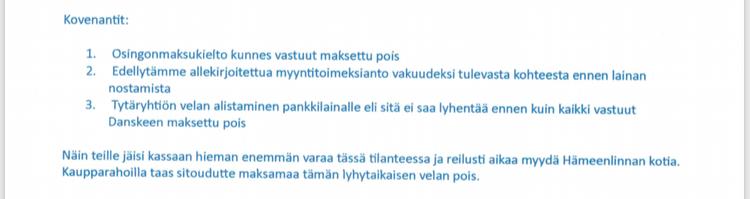 Yrittäjän verenpaine otti loikan ylöspäin, kun Danske Bankin lainatarjous saapui. Lainaehtojen mukaan laina voidaan myöntää, mutta ehtona on muun muassa osingonmaksukielto ja tytäryhtiön lainanlyhennyskielto.