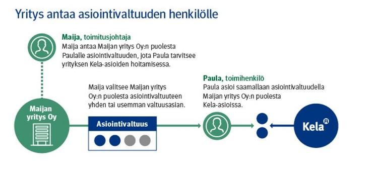 Kela neuvoo omien asiointikanavien käyttötapauksissa ja Digi- ja väestötietoviraston organisaationeuvonta neuvoo, jos valtuusketjun rakentaminen ei tahdo onnistua.