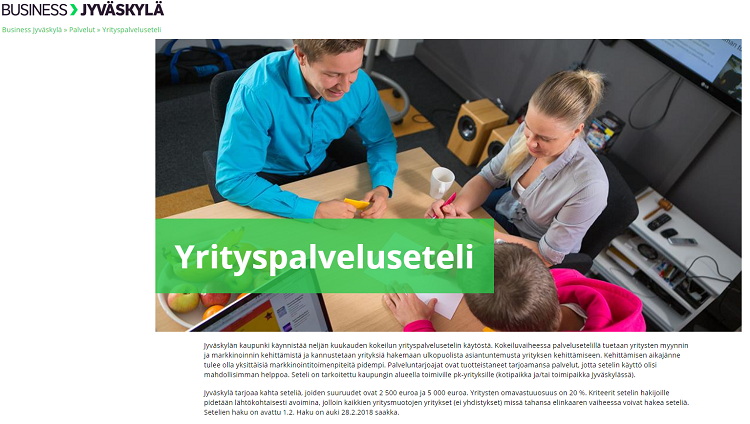 Jyväskylän kaupungin elinkeinoyksikkö Business Jyväskylä myönsi yrityspalvelusetelin 39 yritykselle 215 hakijan joukosta toukokuussa 2018. Yrityspalvelusetelit myönnettiin myynnin ja markkinoinnin pitkäjänteiseen kehittämiseen tai digitalisaation edistämiseen.
