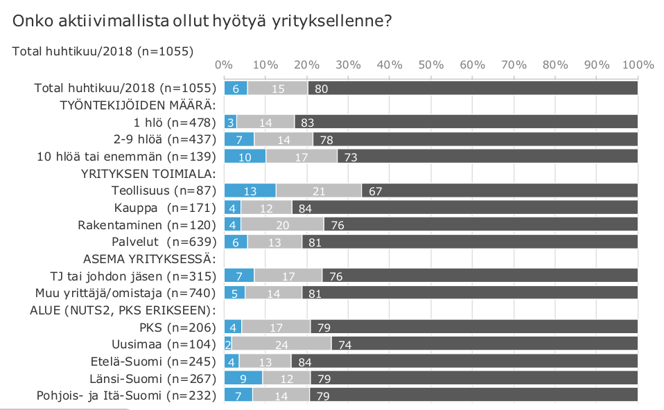 Yrittäjägallupin tulosten perusteella vuoden alusta voimaan tulleesta aktiivimallista ei ole ollut yrityksille juurikaan hyötyä. Vastaajista 80 prosenttia yrittäjistä vastasi kielteisesti kysymykseen, onko aktiivimallista ollut hyötyä. Omaa kantaansa ei osannut ilmaista 15 prosenttia vastaajista.