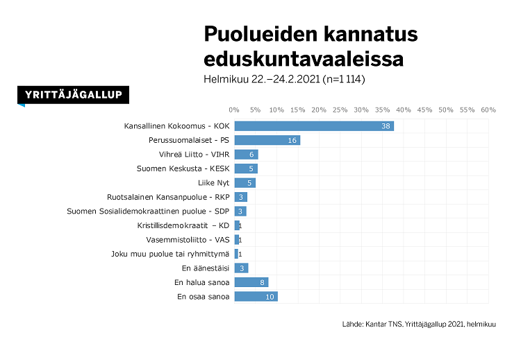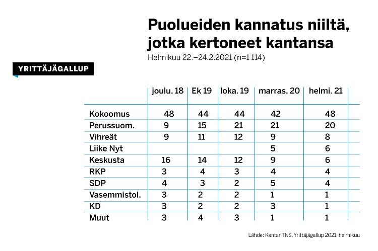 Kokoomus on vielä aiempaa selkeämmin yrittäjien ykköspuolue. Perussuomalaisia kannattaa noin viidennes yrittäjistä. Yrittäjä-kansanedustaja Harry Harkimon perustama Liike Nyt on noussut keskustan rinnalle yrittäjäpuolueena.
