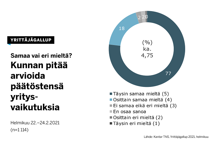Pitääkö kunnan tai kaupungin arvioida, miten sen päätökset vaikuttavat yrityksiin? Yli tuhannen vastaajan Yrittäjägallupin mukaan ehdottomasti: yrittäjistä 77 prosenttia oli väittämän kanssa täysin samaa mieltä, osittain samaa mieltä oli 18 prosenttia vastaajista. Arvioinnin tärkeys korostui yli 5 henkilöä työllistävien yritysten sekä teollisuuden ja kaupan toimialojen vastauksissa.
