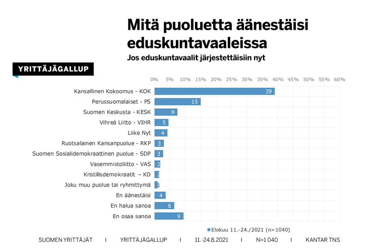 Kantar tutki yrittäjien puoluekannatuslukuja Yrittäjien toimeksiannosta. Tutkimuksessa haastateltiin 1040 yrittäjää tai yrityksen edustajaa.
