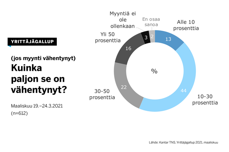 Myynnin vähennys on ollut monissa yrityksissä erittäin iso. 16 prosentilla niistä yrityksistä, joilla myynti väheni, pudotus oli yli 50 prosenttia. 22 prosentilla myynti väheni 30–50 prosenttia ja 44 prosentilla vähennys oli 10–30 prosenttia.