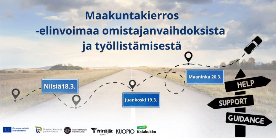 Kuopion Yrittäjien hallinnoima Yksinyrittäjästä työnantajaksi – palvelu, joka auttaa yksinyrittäjiä myös omistajanvaihdoksissa, järjestää maaliskuussa kiertueen Kuopion reuna-alueille: Nilsiään 18.3., Juankoskelle 19.3. ja Maaningalle 20.3. Mukaan kiertueelle tulevat myös Business Kuopion, TyöNavigaattorin, Kuopionseudun Uusyrityskeskuksen, Kehittämisyhtiö Kalakukon sekä Osaamisperusteinen rekrytointi –hankkeen asiantuntijat.