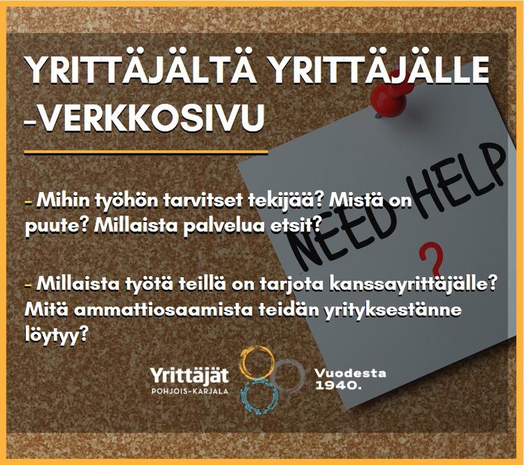 Meitä yrittäjiä on yrittäjäjärjestön jäsenistössä n. 2600 kpl. Tämä tarkoittaa, että osaamista meillä löytyy määrällisesti vähintään yhtä paljon sekä laidasta laitaan. Yrittäjältä yrittäjälle -verkkosivulla voit tuoda esille joko yrityksesi tarjoamia palveluita tai tarpeesi toisen yrittäjän tarjonnalle näppärien lomakkeiden avulla.
