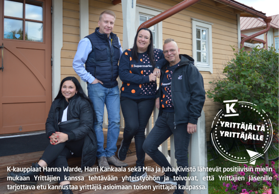 - Kauppojen tarjoama viiden prosentin alennus elintarvikkeista yrittäjäjärjestön jäsenille on voimakas kannustin tehdä ostoksia läheltä ja tukea toisia yrittäjiä. Kun valitsee tehdä ostoksia yrittäjävetoisessa K-kaupassa, tukee paikallista kauppaa ja sen työntekijöitä, mikä vahvistaa koko yhteisöä. Yrittäjä ymmärtää, kuinka tärkeää on tukea toisia yrittäjiä, Kankaala toteaa.