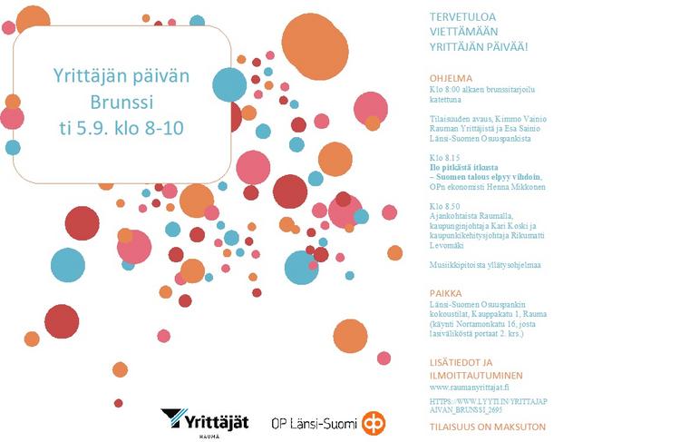 Ilmoittaudu mukaan Yrittäjän päivän aamubrunssille. Ohjelmassa ajankohtaiskatsaus taloustilanteeseen sekä kuulemme myös kuulumiset Rauman kaupungilta.
