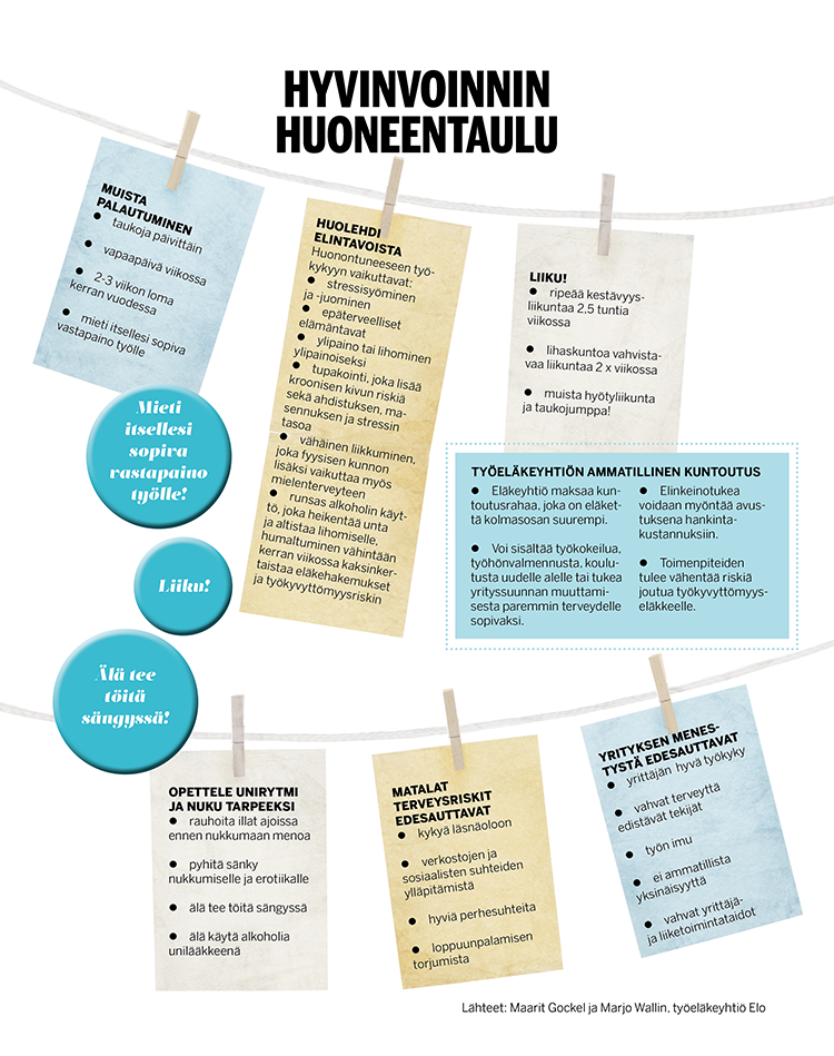 Elon lääketieteellinen johtaja ja fysiatri Maarit Gockelin mukaan alkoholin suurkuluttajia työikäisistä miehistä on joka viides ja naisista joka kymmenes. Normaalipainoisia työikäisistä on vajaa kolmannes. Vain joka kymmenes liikkuu suositusten mukaan, ja työikäisistä miehistä joka viides ja naisista 13 prosenttia tupakoi. Joka viides työikäinen nukkuu liian vähän.