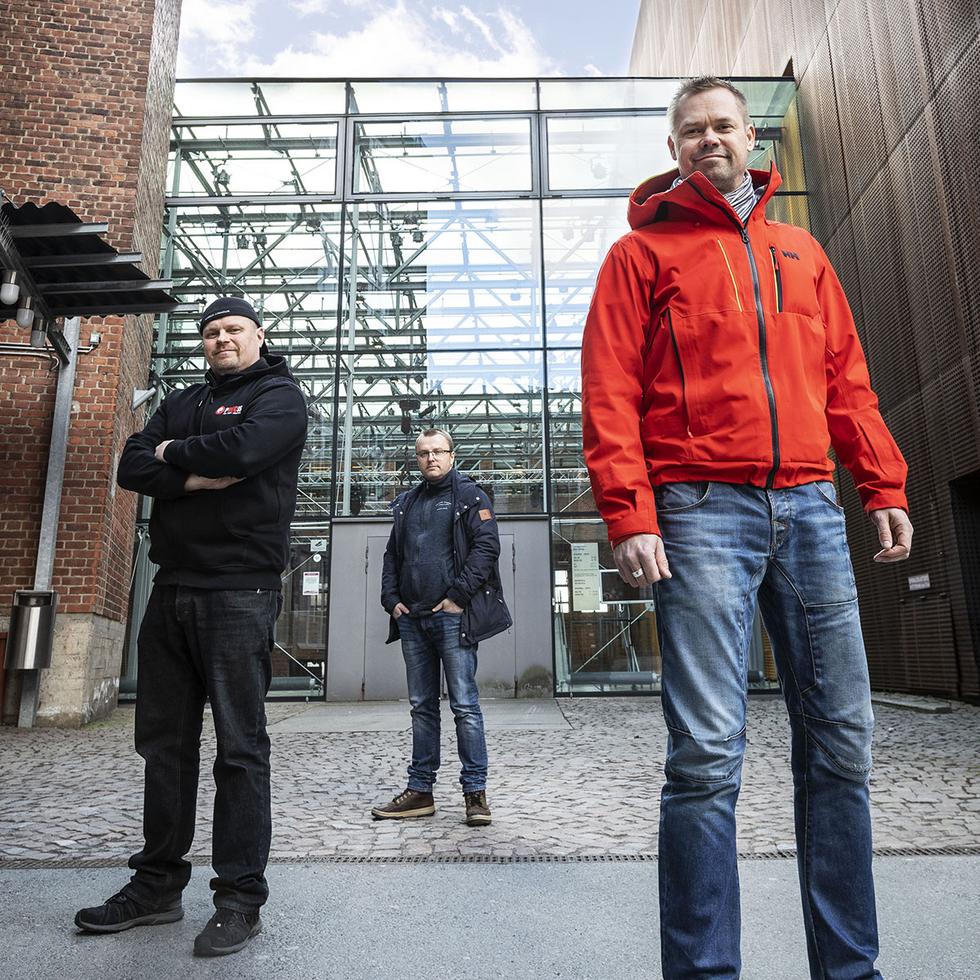 Turvavälein yli koronakesän. Kuvassa vasemmalta Preciksen Tapio Aulu ja Jukka Turunen sekä Parooninmäen Moukarin Kari Häti. Kuva: Precis Oy