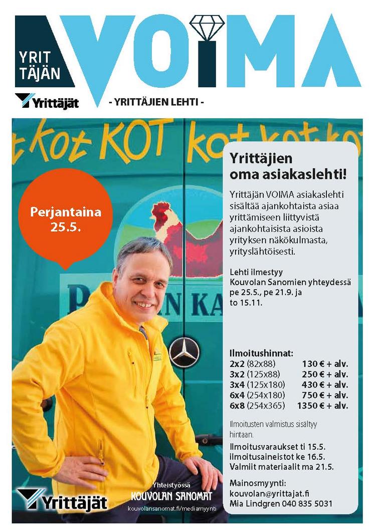 Yrittäjäyhdistykset julkaisevat tänäkin vuonna 4 numeroa Yrittäjän Voima-liitelehteä Kouvolan Sanomien välissä. Julkaisupäivät ovat pe.9.3, pe.25.5, pe.21.9 ja to.15.11.2018.