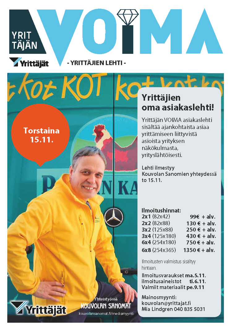 Vuoden viimeinen paikallisyhditysten Yrittäjän Voima nr.4 ilmestyy Kouvolan Sanomien välissä torstaina 15.11. Ilmoitusmyynti käy kuumana, varaa oma paikkasi pian! Uutuutena vuoden viimeisessä numerossa on ”pikkuilmoitus” 2×1(82×42) pikkujouluajan ilmoituksia, tarjouksia, tapahtumia, tervehdyksiä tai mitä tahansa muuta ilmoittelua varten 99€+alv. Hinnat tarkemmin kuvan mediakortista.