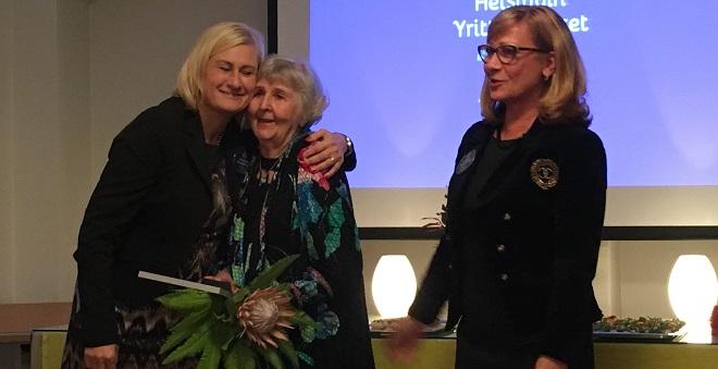 Helsingin yrittäjänaiset antoivat Elämäntyömerkin kenkäkauppiaana Helsingissä yrittäjäuransa tehneelle Airi Salmisalolle.