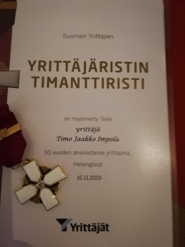 Suomen Yrittäjien Yrittäjäristin timanttiristi on myönnetty yli 30 vuoden ansioista yrittäjänä Timo Impolalle.