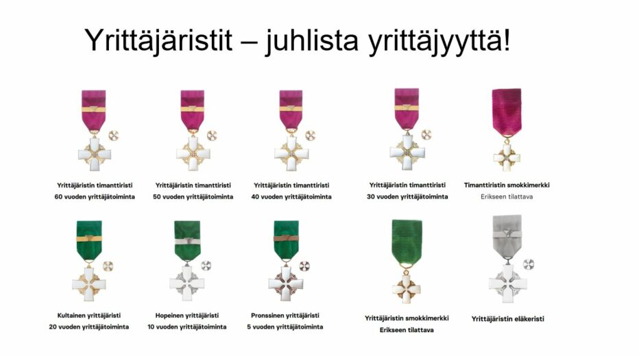 Vuosikymmeniä kestänyt yrittäjäura on saavutus, josta voi olla ylpeä ja kiitollinen. Yrittäjäristin timanttiristejä on neljä; 60, 50, 40 ja 30 vuoden yrittäjätoiminnasta huomioimiseen.