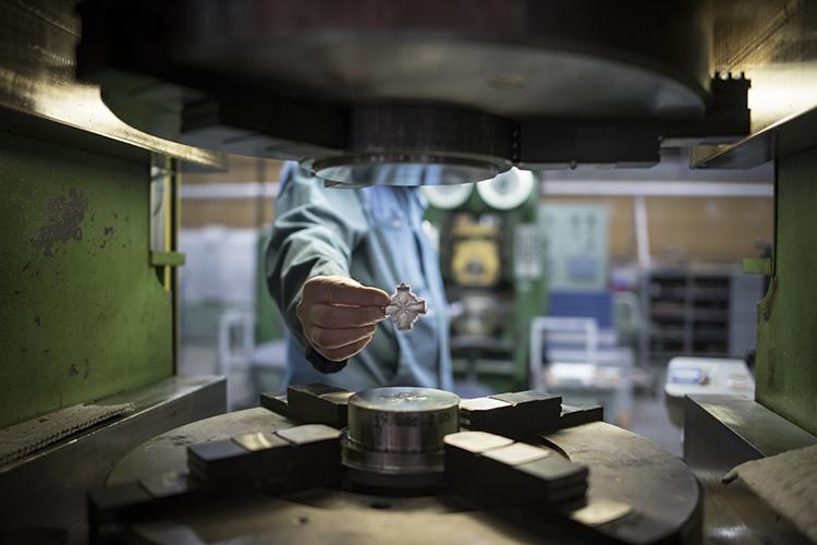 Ansioristien valmistus alkaa tehtaalla puristimella, jossa on 1350 tonnin puristusvoima. Vaihetyöntekijä Matti Sarvala tekee ristin alkupalan 925/000-hopeasta. Jokaisen työvaiheen jälkeen on laaduntarkastus.