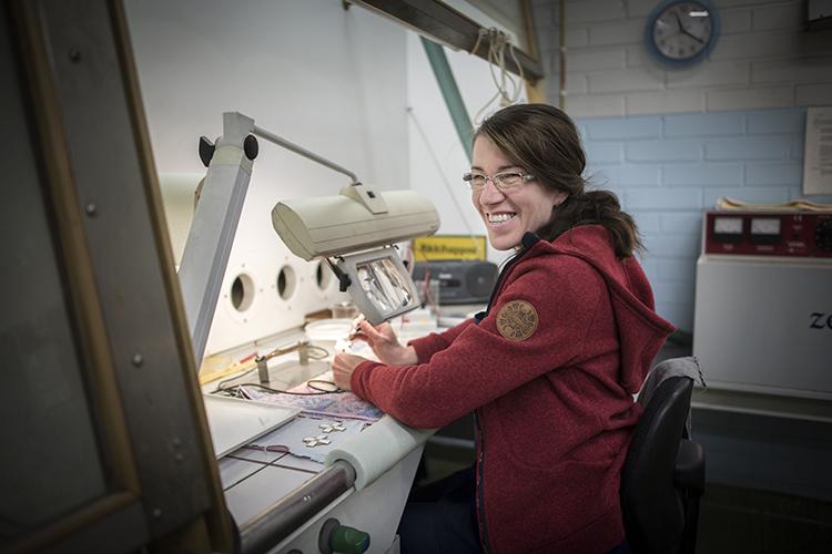 Pieni timantin ympärillä oleva keskusristi rodioidaan eli päällystetään platinametallilla. Marja Aronen tekee tarkkaa työtä suurennuslasin läpi.