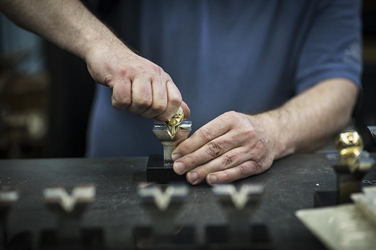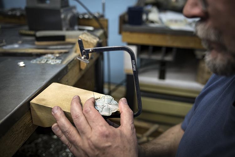 Yksi tarkimmista vaiheista on timantin istutus timanttiristiin. 0,02 karaatin timantti tulee yleensä Belgiasta, kulta useimmiten Saksasta tai Ruotsista. Sami Laatikainen istuttaa timantit varmoin käsin ristin keskelle.