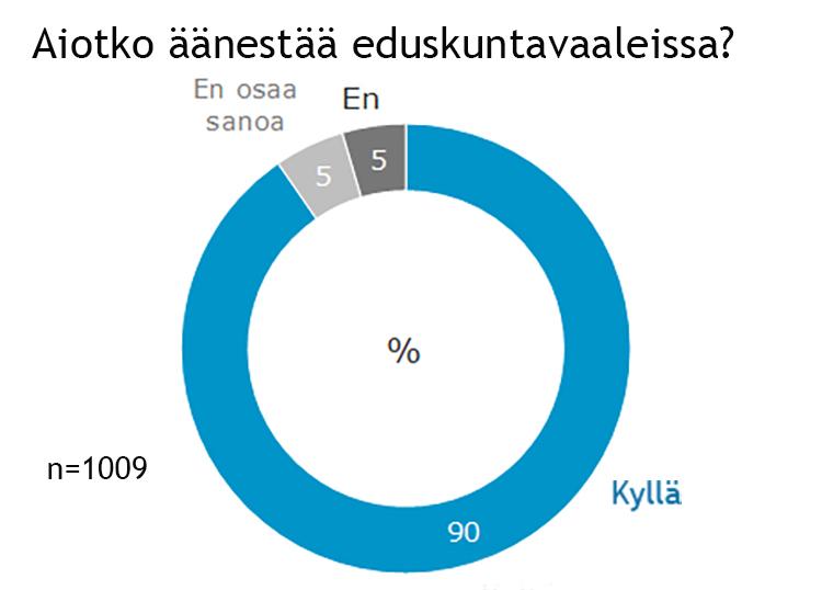 Pk-yrittäjistä aikoo äänestää eduskuntavaaleissa peräti 90 prosenttia. Vain viisi prosenttia kertoo, että ei aio äänestää. Viisi prosenttia ei osaa sanoa, äänestääkö.