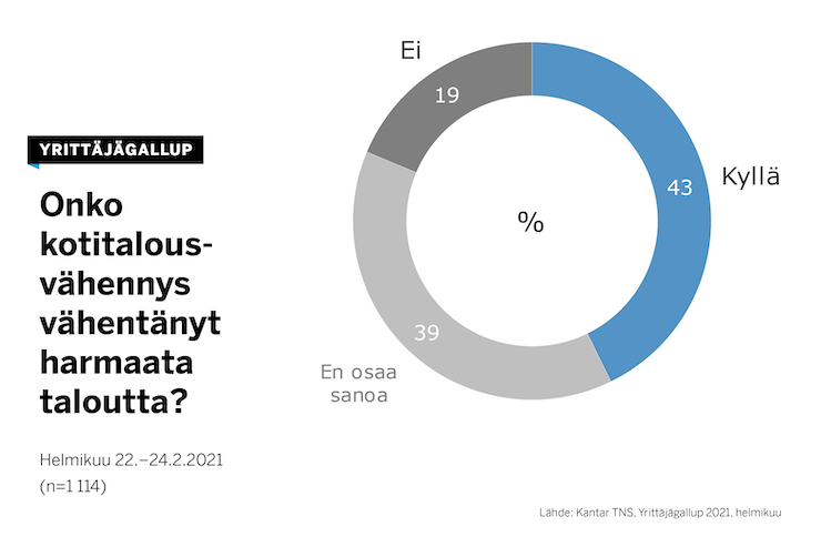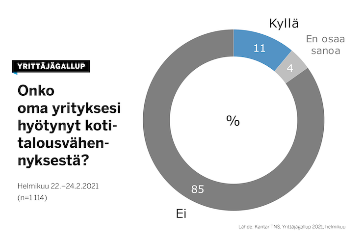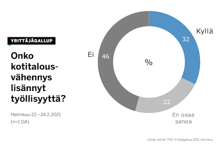 Tuoreen Yrittäjägallupin tulosten perusteella yrittäjät uskovat laajalti, että kotitalousvähennys on vähentänyt harmaata taloutta. Näin arvioi 43 prosenttia vastaajista. Yrityksistä 11 prosenttia kertoo hyötyneensä vähennyksestä.