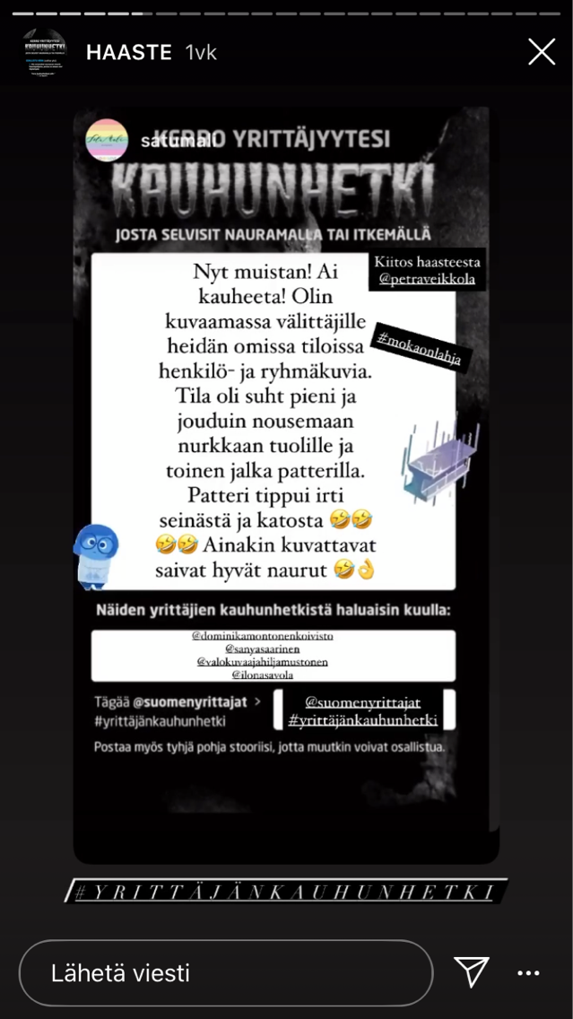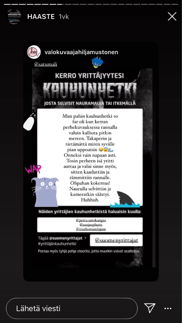 Tarinoiden keräys on käynnissä Suomen Yrittäjien Instagram-tilillä story-osiossa Haaste-otsikon alla.