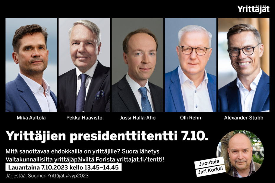 Presidenttiehdokkaiden tentin juontaa toimittaja, tietokirjailija Jari Korkki. Lauantaina kello 13.45 alkavaa tunnin tenttiä voi seurata suorana verkosta osoitteessa yrittajat.fi/tentti