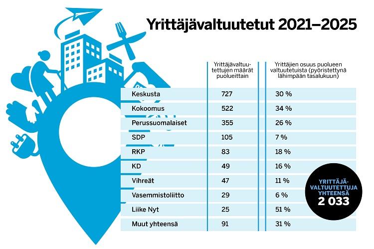 Eniten yrittäjävaltuutettuja eri puolilla Suomea on keskustalla (727), toiseksi eniten kokoomuksella (522) ja kolmanneksi perussuomalaisilla (355). LiikeNytin valtuutetuista yli puolet ovat yrittäjiä.