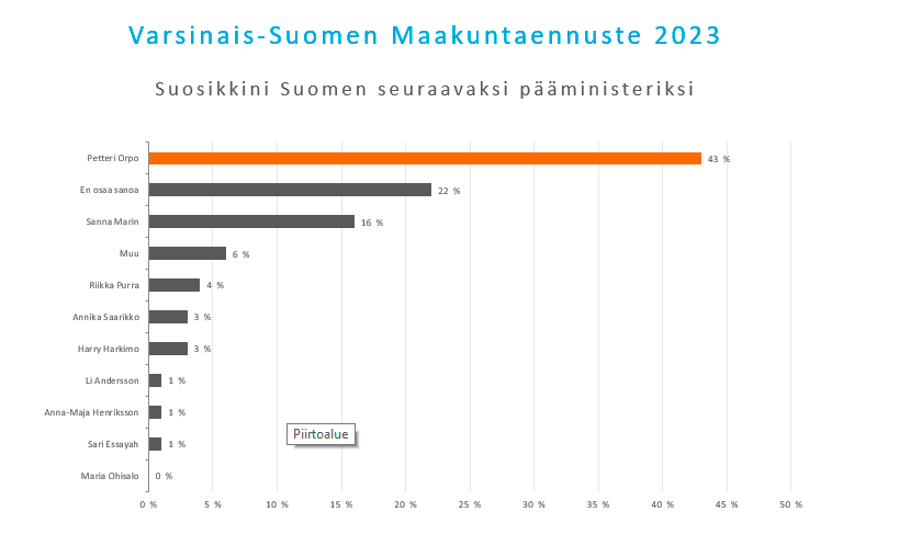 Jos varsinaissuomalaiset yrittäjät saisivat päättää, seuraavaa hallitusta johtaisi kokoomuksen Petteri Orpo. Hän nousi kyselyssä yrittäjien seuraavaksi pääministerisuosikiksi, kun 43 prosenttia vastaajista pitää Orpoa omana suosikkinaan seuraavaksi pääministeriksi. Kysely kertoo myös, että noin viidennes vastaajista ei osaa vielä kertoa omaa pääministerisuosikkiaan.