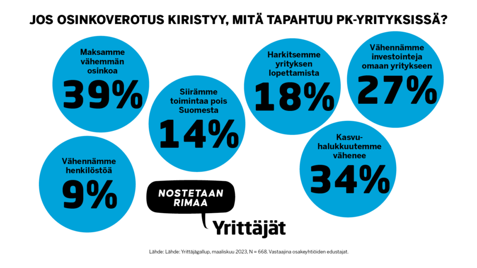 Yli kymmenen työllistävistä yrityksistä (vastaajia 1 038, joukossa myös muita yhtiömuotoja kuin osakeyhtiöitä) 44 prosenttia oli sitä mieltä, että osinkoverotuksen kiristäminen vähentäisi kasvuhaluja. 42 prosenttia maksaisi vähemmän osinkoja, 40 prosenttia vähentäisi investointeja yritykseensä ja 25 prosenttia siirtäisi toimintaa Suomesta.