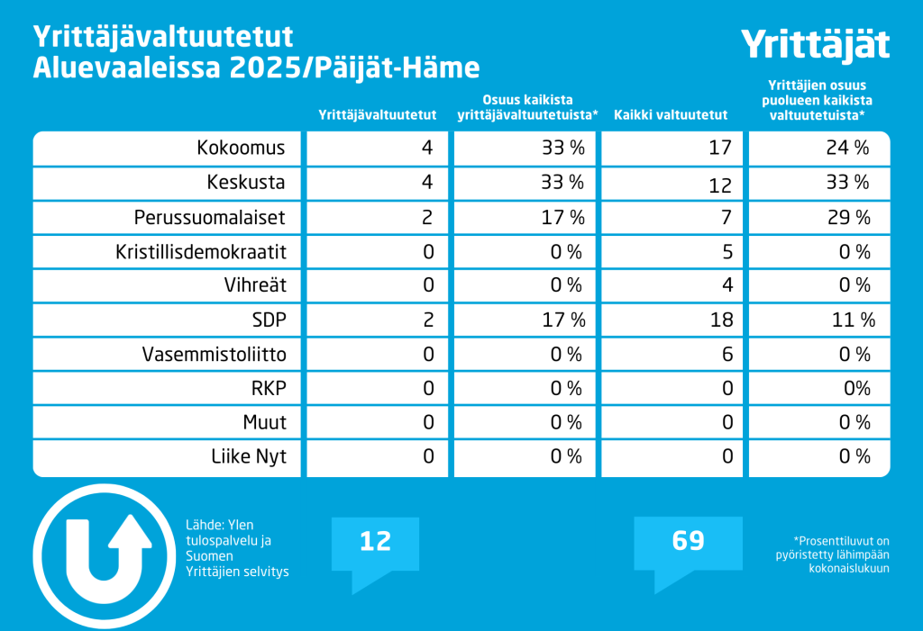Aluevaaleissa Päijät-Hämeen hyvinvointialueen aluevaltuustoon valittiin 12 yrittäjää, eli yli 17 prosenttia alueen 69 valtuustopaikasta. Varasijalle valittiin 13 yrittäjätaustaista ehdokasta.